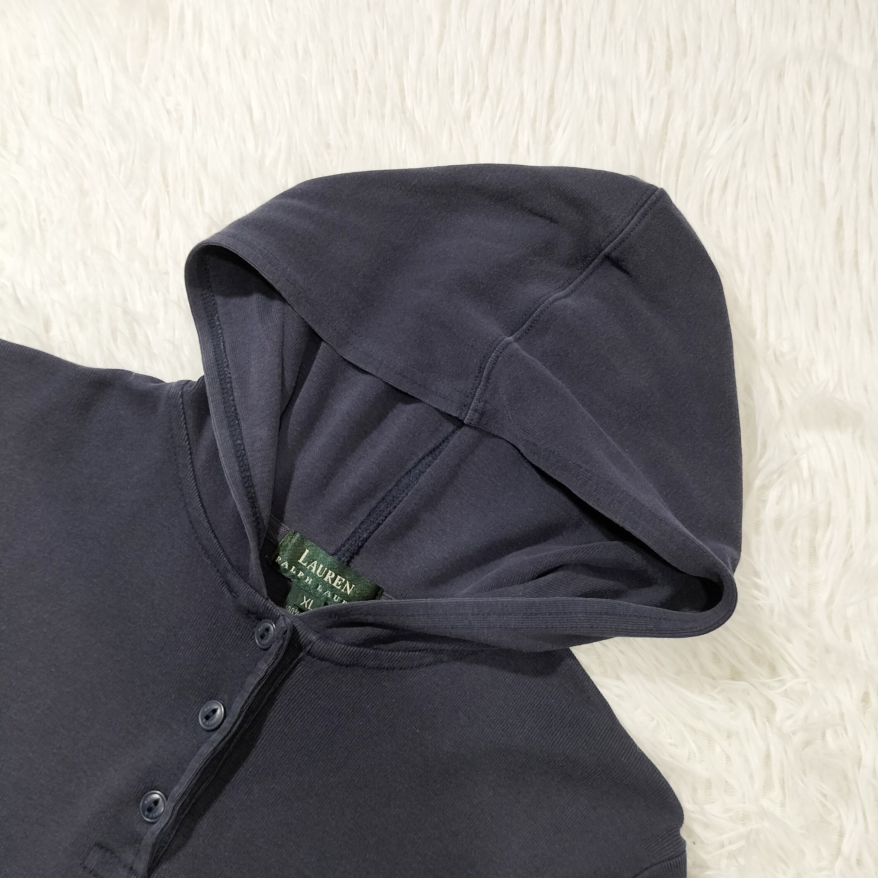 【夏物処分セール】LAUREN RALPH LAUREN ローレンラルフローレン 半袖ワンピース ロング丈 フード付き カジュアル リラックス感 レディース ネイビー XLサイズ